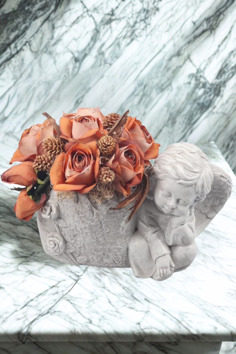 Aranžmán anjel s črepníkom a ružami