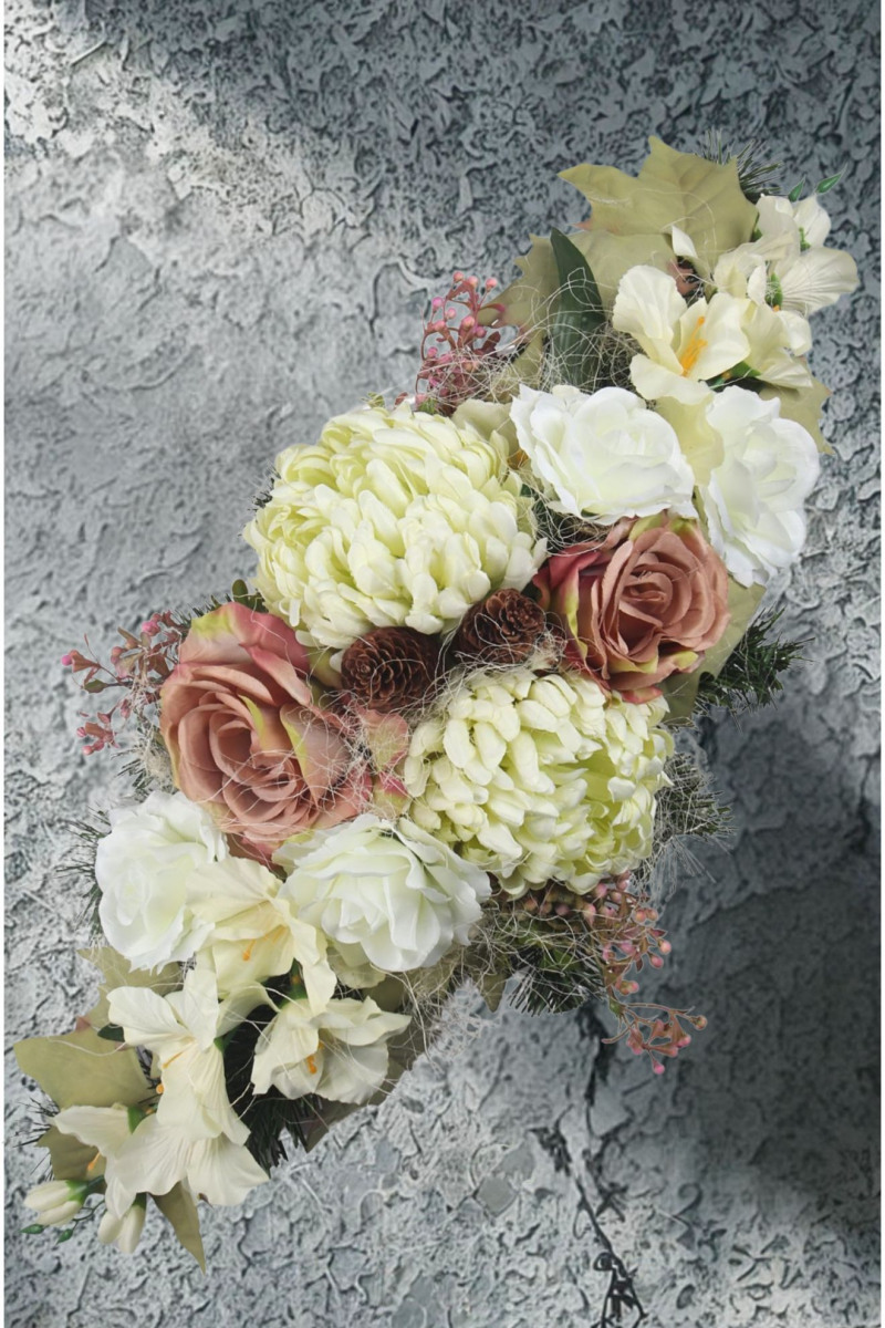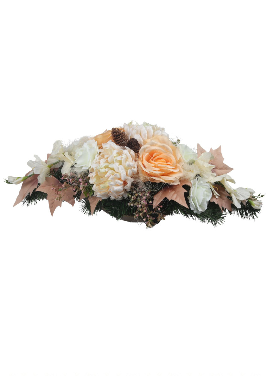 Aranžmán miska betónová, chryzantémy, gladioly, ruže, list javor, prízdoby,sušina, sieťka