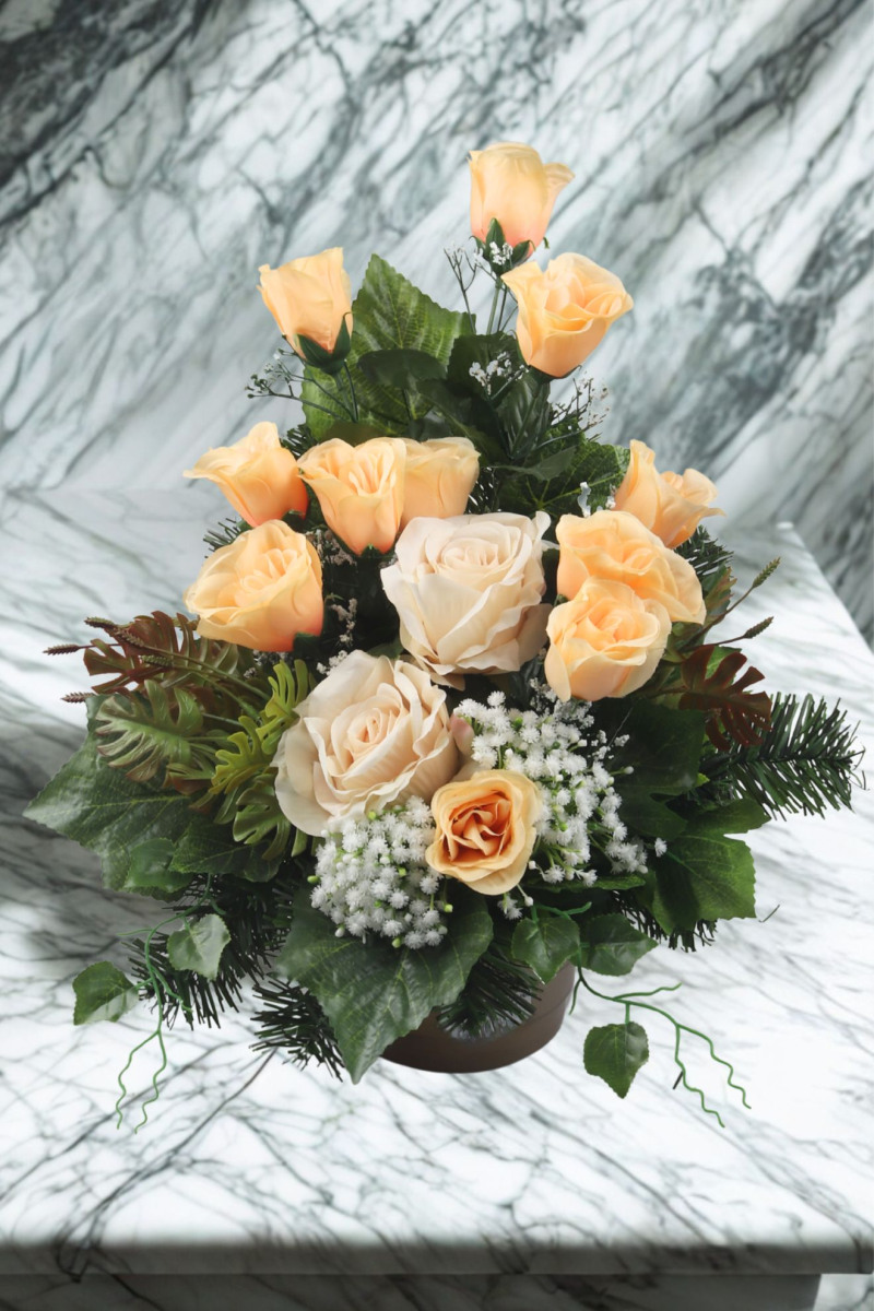 Aranžmán miska betónová 332 postupná, ruže vencovky, florex suchý, listy, prízdoby a doplnky