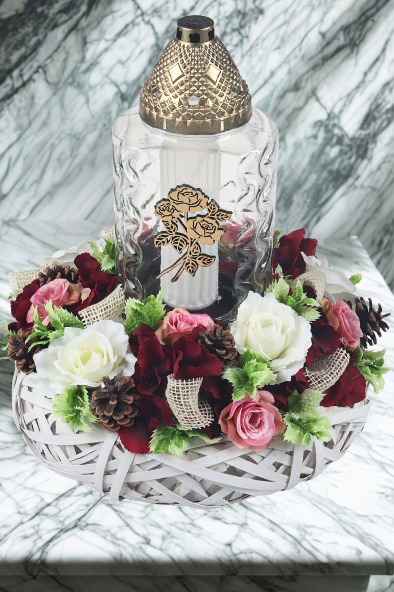 Aranžmán črepník biely prútený, florex Sec, hortenzie hl., ruža rozvinutá hl., kahanec sklenený, prízdoby a doplnky