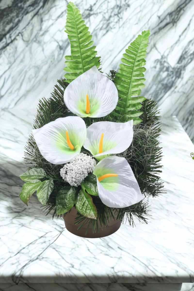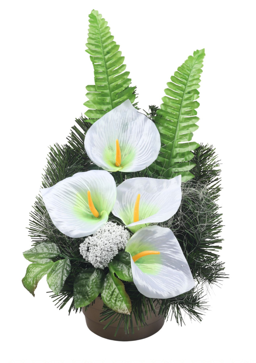 Aranžmán miska betónová 332, listy -ruža a papraď, vencovka kály saténové, prízdoby a doplnky.