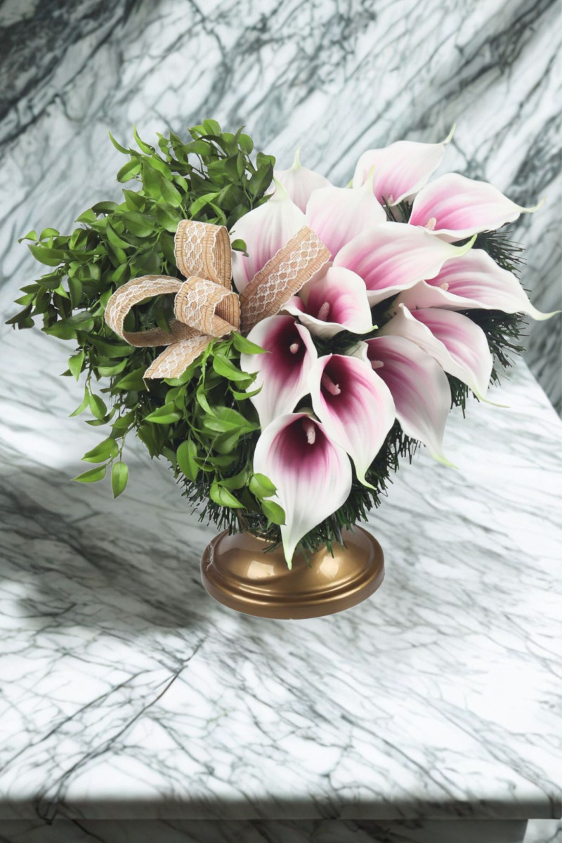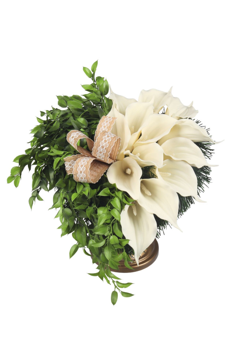 Aranžmán betón na nožičke v tvare srdca s kálami