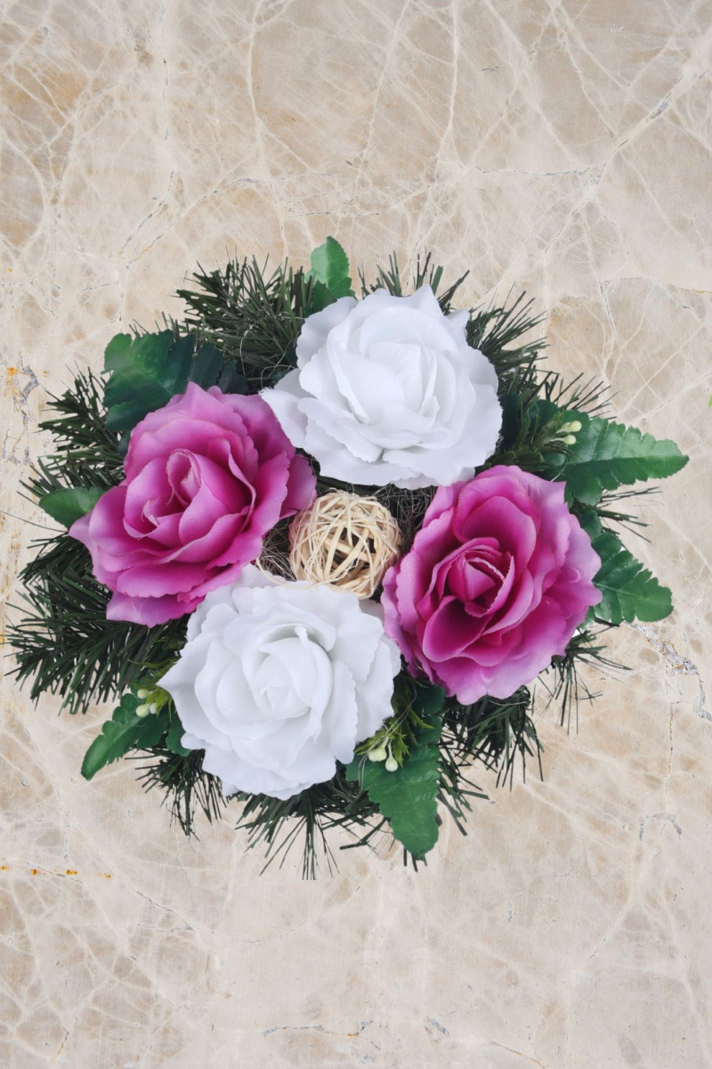 Aranžmán miska betónová 331, ruže, doplnky