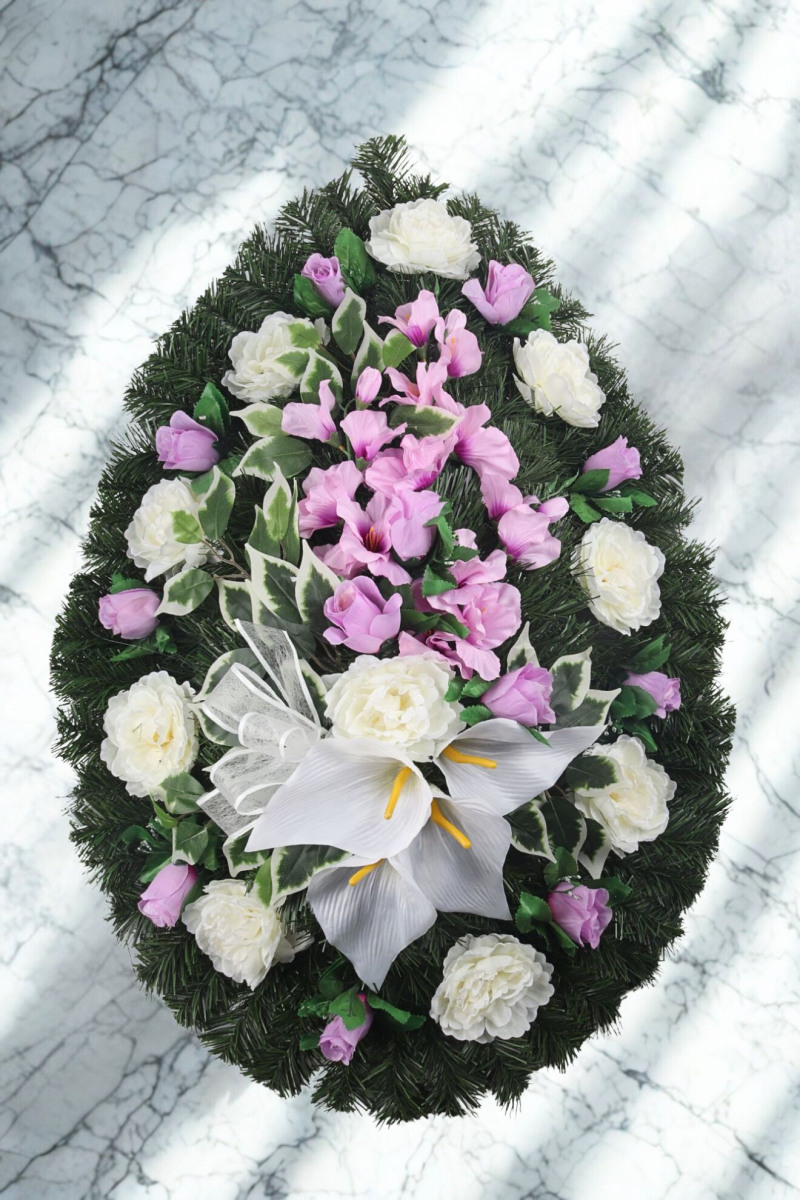 Veniec slza smrek 98 cm drôtený rám, peónie, ruže puky, gladioly, kály a doplnky