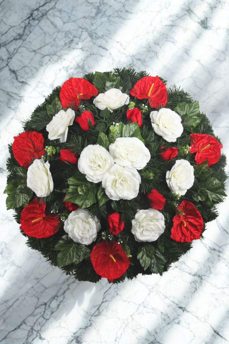 Veniec smrek plný 77 cm drôtený rám, ruže, antúrie a doplnky